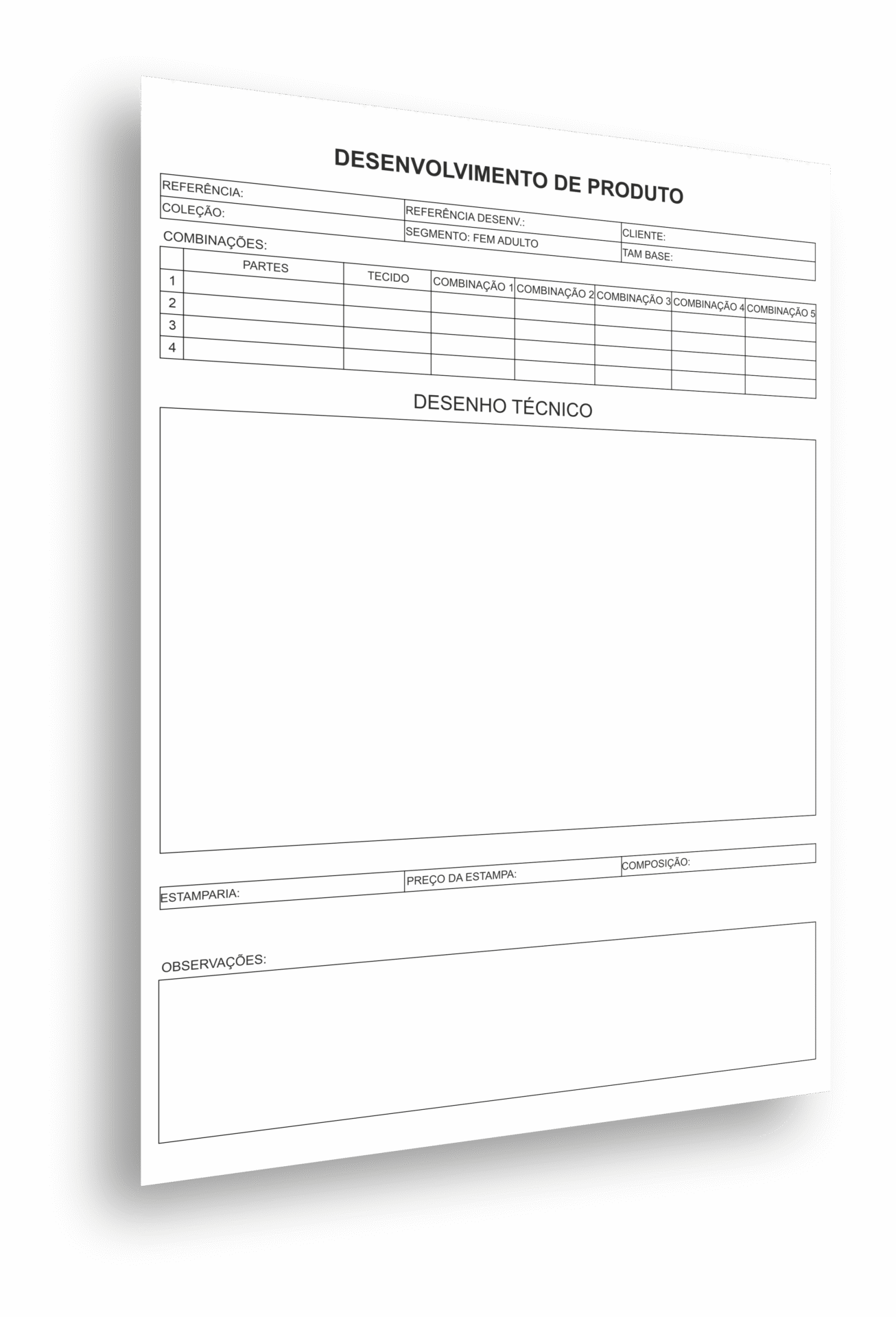 Tamplate de ficha técnica criativa, com todos os principais campos de informação do produto.