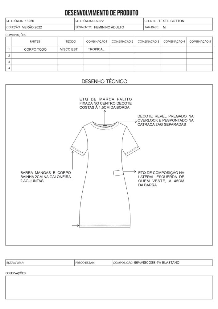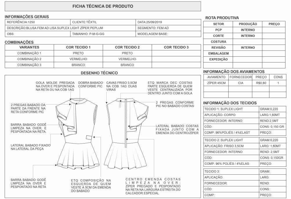 Ficha técnica de produção: Ficha técnica completa para o seu produto já aprovado, com todos campos necessários de identificação, combinações e processos do modelo.