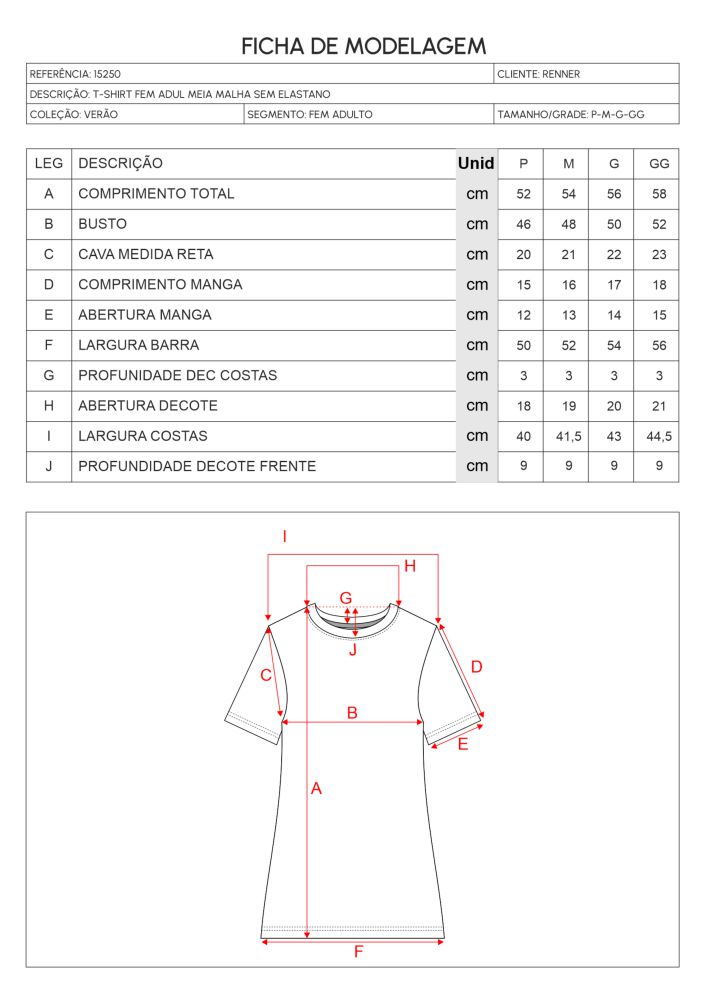 Ficha de modelagem e medidas: Tenha uma padrão das medidas das suas peças. Aponte as orientações de medidas, e seus valores para cada tamanho e modelo, facilitando o processo de montagem do molde padronizado, e conferência de medidas após o modelo pronto!